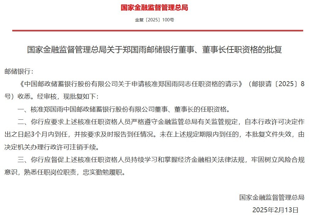 【大河财立方消息】2月14日消息,国家金融监督管理总局发布批复,核准郑国雨中国邮政储蓄银行股份有限公司董事、董事长的任职资格。